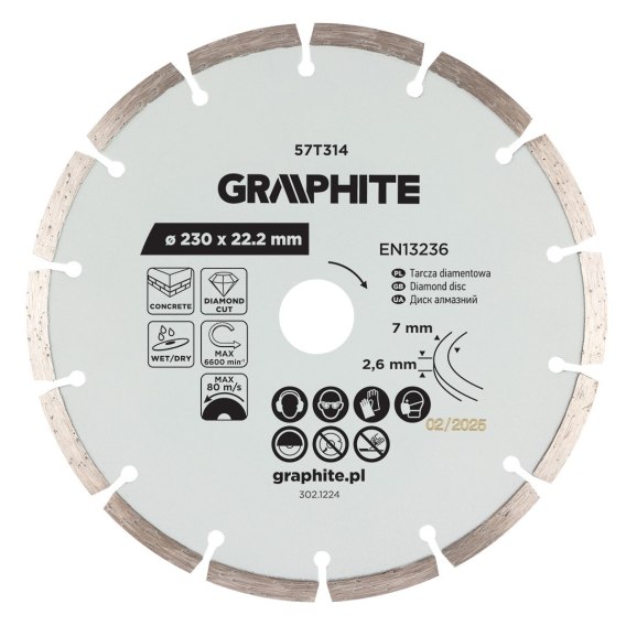 Tarcza diamentowa do cięcia segmentowa, 230 x 22.2 mm, na sucho i mokro o średnicy: 230mm, średnica otworu montażowego: 22,2mm, wysokość segmentu: 7 mm szerokość: 2,4 mm, maksymalna prędkość obrotowa: 80 m/s, rpm = 6600 obr./min, do cięcia: na sucho lub mokro, norma: EN 13236