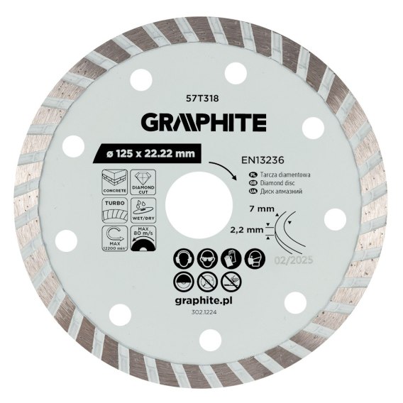 Tarcza diamentowa do cięcia turbo, 125 x 22.22 mm, na sucho i mokro o średnicy: 125mm, średnica otworu montażowego: 22,22mm, wysokość segmentu: 7 mm szerokość: 2,2 mm, maksymalna prędkość obrotowa: 80 m/s, rpm = 12200 obr./min, do cięcia: na sucho lub mokro, norma: EN 13236