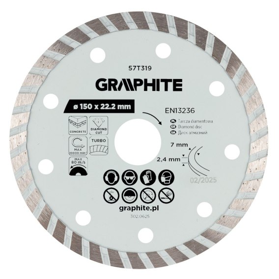 Tarcza diamentowa do cięcia turbo, 150 x 22.22 mm, na sucho o średnicy: 150mm, średnica otworu montażowego: 22,2mm, wysokość segmentu: 7 mm szerokość: 2,4 mm, maksymalna prędkość obrotowa: 80 m/s, rpm = 10000 obr./min, do cięcia: na sucho, norma: EN 13236