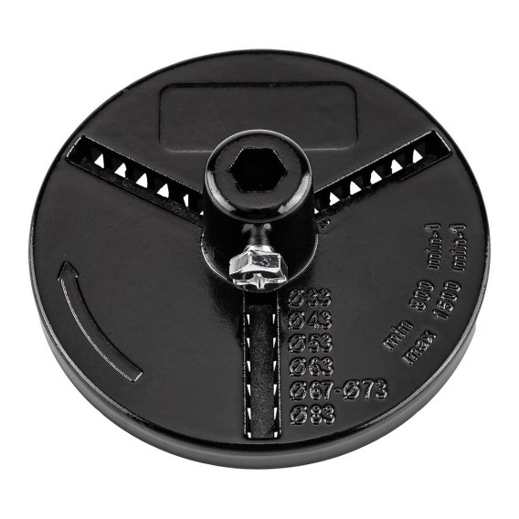 Tarcza do otwornic wolframowych o zakresie średnic 33-83 mm, materiał wykonania aluminium, pasuje do 56T745 wiertło pilotujące do otwornic wolframowych oraz otwornic wolframowych 56T738-56T742 o średnicach: 33, 43, 53, 67, 73 mm.