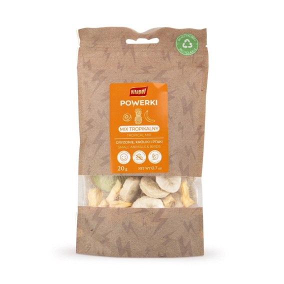 VITAPOL Powerki Mix Tropikalny to liofilizowana przekąska stworzona dla gryzoni, królików i ptaków egzotycznych, łącząca wyjątkowy smak tropikalnych owoców z ich cennymi właściwościami odżywczymi.