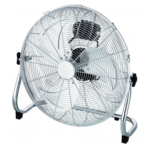 - Metalowy, chromowany, solidny wentylator podłogowy, do zastosowania w pomieszczeniach.