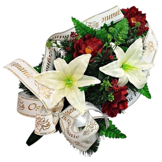 Wiązankę cechuje gęsty splot sztucznych gałązek iglastych, które tworzą estetycznie wyglądające tło dla unikalnej kompozycji kwiatów. Starannie dobrane kwiaty są niezwykle realistyczne i naturalne, dodając wiązance autentyczności i podkreślając jej uroczysty charakter.