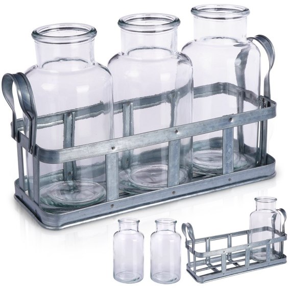 Zestaw trzech wazonów na kwiaty ze stojakiem, przydatny w każdym domu. Idealny do przechowywania kwiatów żywych oraz sztucznych, a także dekoracji. Zestaw pozwoli stworzyć różnorodne kompozycje kwiatowe lub wyeksponować kilka rodzajów kwiatów jednocześnie. Przezroczysta forma wazonów pozwoli na wygodne monitorowanie poziomu wody. Stojak zapewnia stabilne przechowywanie wazonów i umożliwia ich łatwe przenoszenie. Zestaw będzie stanowił ozdobę sam w sobie. Wyprodukowano zgodnie z europejskimi standardami.