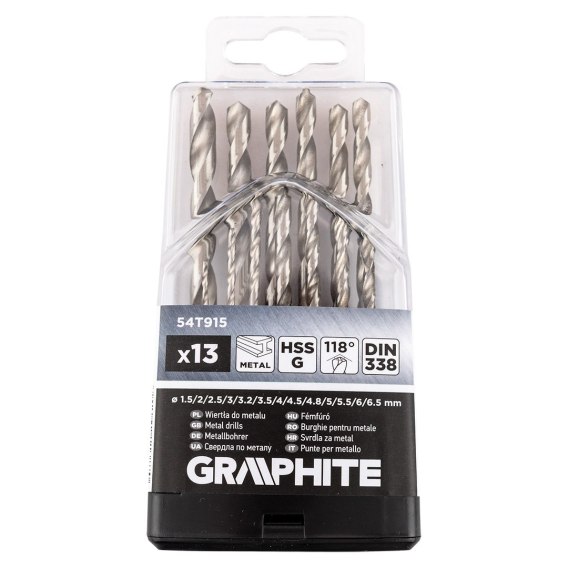Zestaw 13 wieteł do metalu, średnice: 1,5; 2; 2,5; 3; 3,2; 3,5; 4; 4,5; 4,8; 5; 5,5; 6; 6,5mm, wykonane ze stali szybkotnącej HSS-G, uchwyt cylindryczny, kąt zaostrzenia wiartła 118°, zgodność z normą DIN 338, Zastosowanie: metal.
