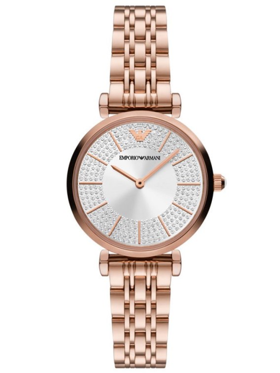 Damski zegarek Emporio Armani AR11446 z serii Gianni T-Bar to elegancki damski zegarek idealny na każdą okazję. Koperta oraz bransoleta zostały wykonane ze stali szlachetnej z powłoką PVD w odcieniu różowego złota, co gwarantuje wieloletnią odporność na zniszczenie. Model posiada dokładny mechanizm kwarcowy zasilany baterią. Srebrną tarczę zdobioną srebrnymi cyrkoniami zabezpiecza odporne na zarysowania szkło mineralne.