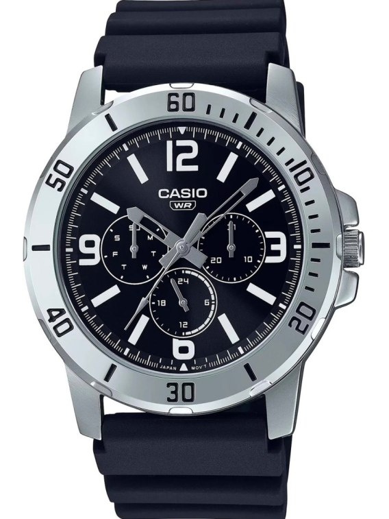 Zegarek napędzany jest precyzyjnym mechanizmem kwarcowym, który gwarantuje dokładność i niezawodność na co dzień. Gumowy pasek, który otacza nadgarstek, zapewnia wygodę noszenia oraz dbałość o detale, a jego klasyczny design sprawia, że zegarek pasuje do szerokiego wachlarza stylizacji. Casio MTP-VD300-1B to doskonała propozycja zarówno dla miłośników eleganckiej klasyki, jak i osób, które szukają zegarka, który łączy funkcjonalność z ponadczasowym stylem.