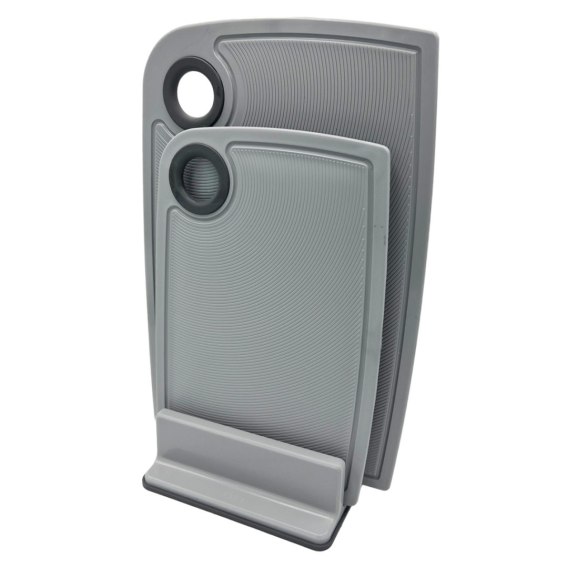 Zestaw desek do krojenia na stojaku ułatwi codzienne przygotowanie posiłków. Plastikowe deski w dwóch rozmiarach zabezpieczą twój blat podczas pracy. Komplet desek kuchennych wyposażonych w antypoślizgowe gumki utrzymują określoną pozycję w czasie ich użytkowania. Zestaw desek kuchennych z dodatkowym stojakiem wprowadzi ład i porządek w twojej kuchni.