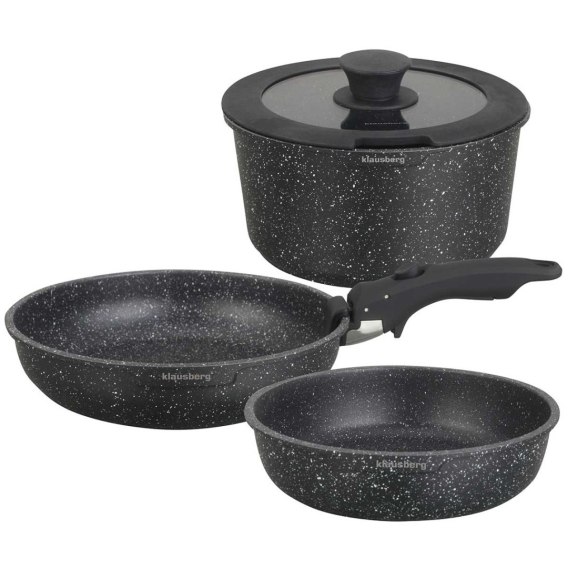 Nowoczesny zestaw naczyń kuchennych z nieprzywierającą powłoką marmurową, która zapewnia zdrowe gotowanie oraz szybkie i równomierne rozprowadzanie ciepła. Naczynia nadają się do przechowywania w lodówce i użytkowania w piekarniku.