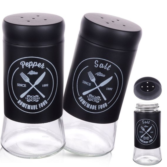 - SOLIDNE - Wykonane z wysokiej jakości szkła oraz metalu w modnym, czarnym kolorze. Białe nadruki precyzyjnie określają przeznaczenie, ułatwiając odróżnienie soli od pieprzu.