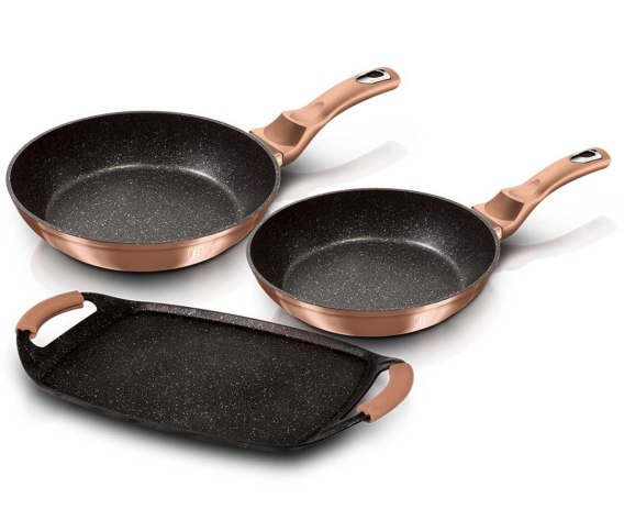 Zestaw 2 patelni + płyta grillowa BERLINGER HAUS z kolekcji ROSE GOLD. Patelnie: Ø22cm, Ø26cm,