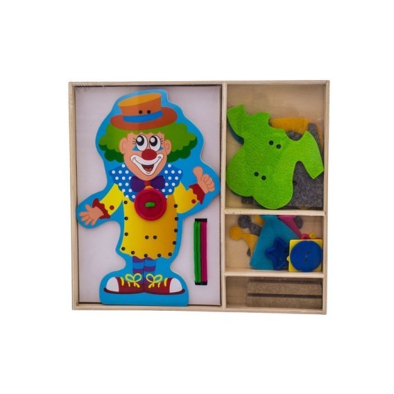 Drewniany Klaun to super zabawka dla dziecka. Dzięki niej twój maluszek nauczy się dopasowywać oraz nawlekać różne elementy tj.: guziki, ubranka. Zabawka rozwija koordynację wzrokowo ruchową ćwicząc precyzję ruchu.