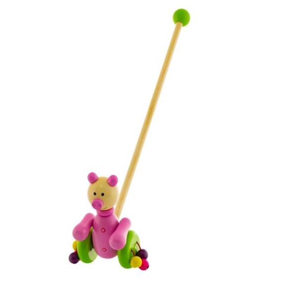 Drewniana zabawka na kółkach typu pchacz. Zabawka posiada piękne żywe kolory oraz kręcące się kółka z koralikami. Zabawka rozwija koordynację wzrokowo ruchową ćwicząc precyzję ruchu.