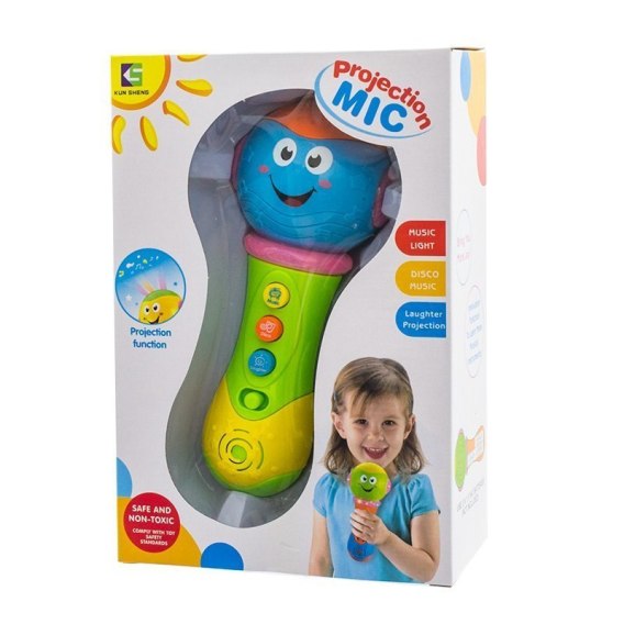 Zabawka mikrofon projektor. Rozwija u dziecka koordynację wzrokowo-ruchową poprzez zabawę. Zabawka posiada migające światełka w czasie zabawy oraz wydaje dźwięki i odgrywa melodie.
