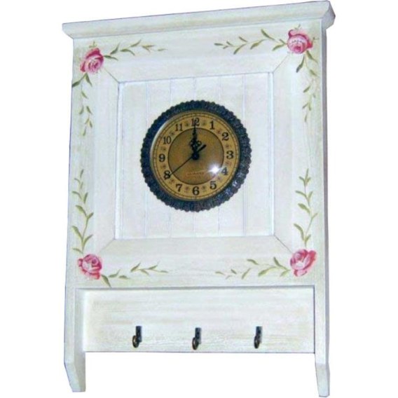 Zegar Wiszący w Stylu Prowansalskim z Wieszakami i Ręcznie Malowanymi Kwiatami, Biały, 49x36x5 cm