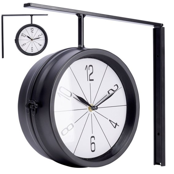 - DWUSTRONNY - Zegar ścienny, dwustronny. Z jego pomocą w łatwy sposób odczytamy godziny z dwóch stron pomieszczeń w których zostanie umiejscowiony. Wymiary zewnętrzne zegara 30,5 x 9,5 x 28 cm. Tarcza zegara ma średnicę 20 cm. Zasilany 2x bateria AA 1,5V (brak w zestawie).