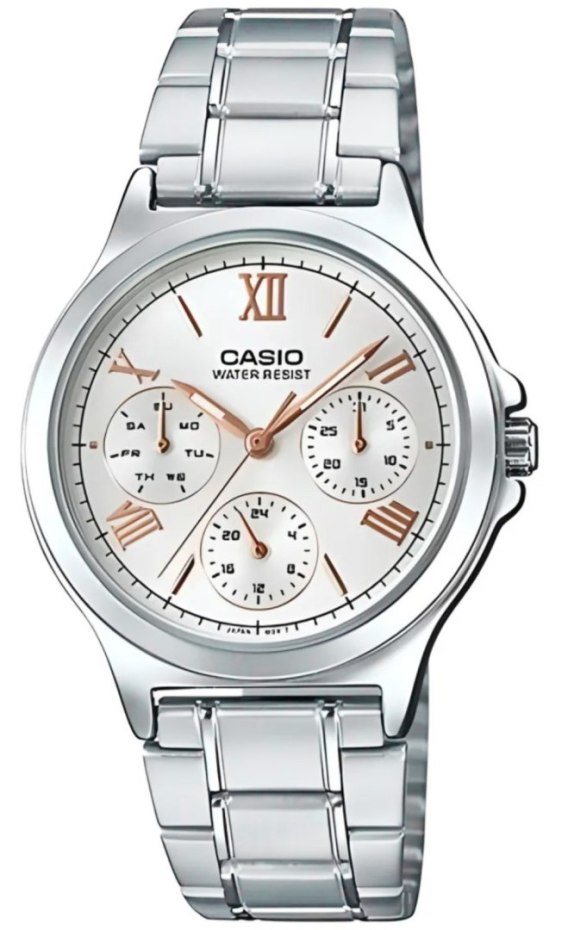 Zegarek CASIO LTP-V300G-7A2UDF to połączenie luksusowego wyglądu i codziennej funkcjonalności. Jego elegancka bransoleta i dopracowana tarcza z delikatnym połyskiem sprawiają, że przyciąga wzrok i doskonale komponuje się z kobiecymi stylizacjami. Trzy dodatkowe subtarcze wskazują dzień tygodnia, datę i czas 24-godzinny, dzięki czemu zawsze masz wszystko pod kontrolą. To zegarek, który nie tylko zdobi nadgarstek, ale też ułatwia organizację dnia. Idealny dla kobiet, które lubią styl i wygodę w jednym.