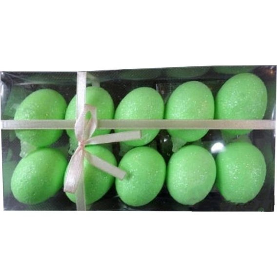 Zestaw 10 brokatowych jajek z zawieszką w zielonym kolorze w plastikowym boksie