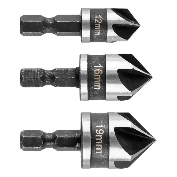 Zestaw fazowników 1/4 Hex do drewna, aluminium oraz tworzyw sztucznych, średnice: 12 mm, 16 mm, 19 mm, długości całkowite: 40 mm, 45 mm, 45 mm